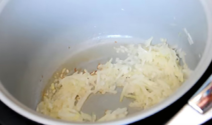 - Versez d'abord l'oignon dans le bol, faites-le frire pendant 3-5 minutes, ajoutez les carottes et faites-le frire pendant 5 minutes.