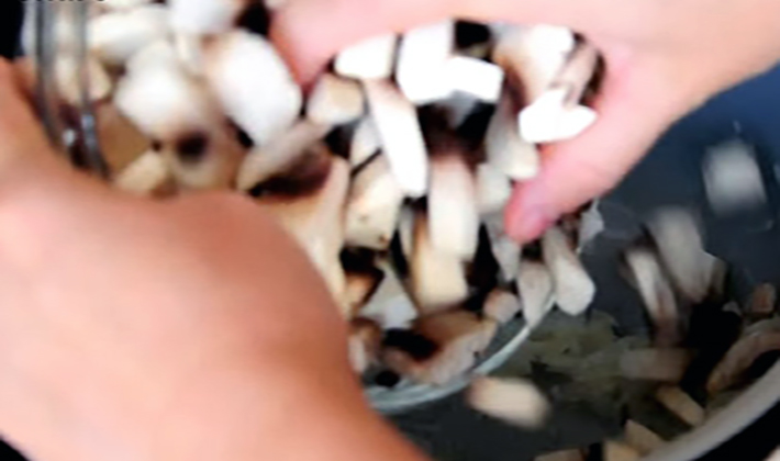 - Décongelez les champignons (il est préférable de les laisser sur la table dans la cuisine pour la nuit), coupez-les en cubes et égouttez-les avec les mains.