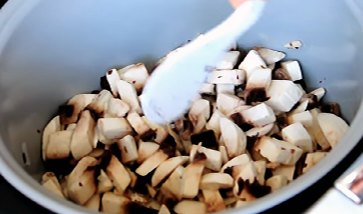- Versez des pailles aux champignons et faites frire le tout pendant 5 à 7 minutes, éteignez la mijoteuse.
