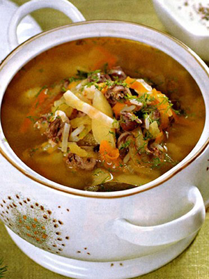 Un cornichon avec une poitrine de poulet, des champignons, des tomates et des concombres sera un excellent premier plat sur la table de la cuisine, qui rassemble rapidement tous les membres de la famille avec son arôme.