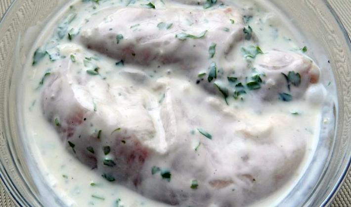Faire mariner les poitrines dans la crème sure à l'ail et au persil.
