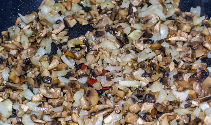 Faites revenir les oignons et le poivron simultanément pendant 3 à 5 minutes, puis mettez les champignons et faites sauter pendant 3 minutes.