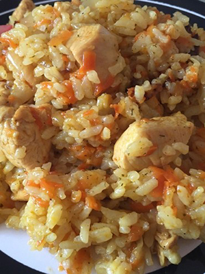 - Poitrine de poulet poêlée avec du riz et des champignons dans une poêle