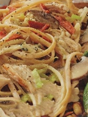 Lorsque les vermicelles sont bien trempés, jetez-y les ingrédients frits et les tomates pelées. Les tomates se pèlent facilement - faites deux coupes transversales sur la peau, puis versez-les avec de l'eau bouillante et pelez-les facilement. Hacher finement les tomates et les ajouter aux pâtes avec le poulet et les champignons sautés. Faites cuire jusqu'à ce que la sauce soit lisse. Servez avec vos légumes préférés.