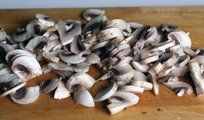 Pendant ce temps, rincez, épluchez et hachez les champignons.