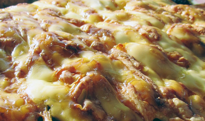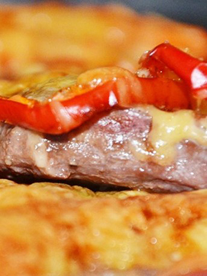 Graisser une poêle avec de l’huile, déposer les tranches de pomme au fond, mettre la viande mélangée avec les champignons sur les pommes, verser la sauce sur le dessus, verser le beurre fondu et cuire au four.