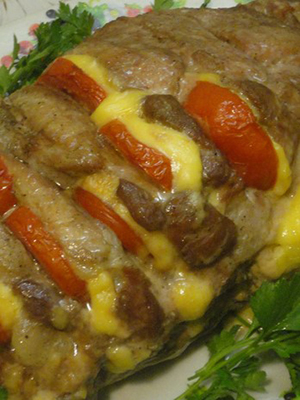 Viande cuite au four avec champignons, jambon et poivre