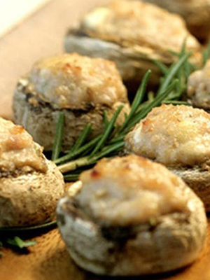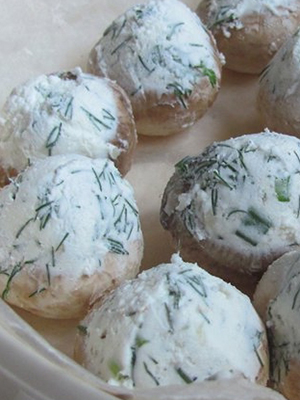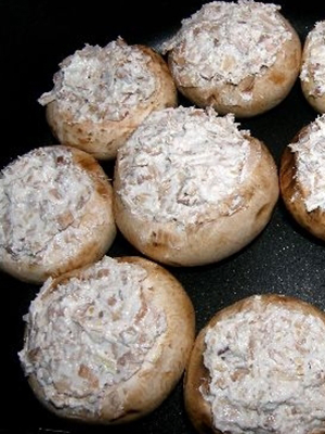 Combinez le fromage cottage, les cuisses, l'ail cru et finement haché (ou l'ail émincé), les verts hachés finement, les épices et l'huile d'olive. Remuez bien la masse. Farcir les chapeaux avec cela et cuire au four pendant une demi-heure. Le fromage fondra et, grâce au beurre, les herbes et l'ail révéleront leur saveur.
