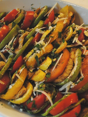 Versez un peu de sauce sur le fond de la casserole. En spirale, disposez les rondelles d’aubergines, de courgettes, de tomates et de morceaux de poivron. Les cercles doivent s'emboîter parfaitement l'un dans l'autre et occuper tout l'espace de la forme. Saupoudrer de persil, verser l'huile d'olive et le reste de la sauce et mettre au four. Cuire au four jusqu'à ce que l'aubergine soit brun clair.