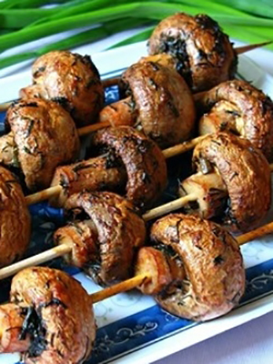Les champignons sont parfaits pour la friture sur le gril: ils ont la forme correcte et sont assez larges pour les placer sur la brochette. Ils cuisent également très rapidement, de sorte que la croûte appétissante du feu a le temps de prendre, mais pas de brûler.