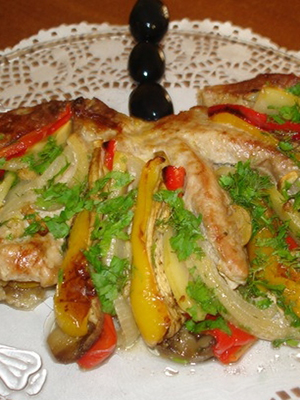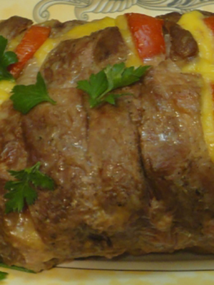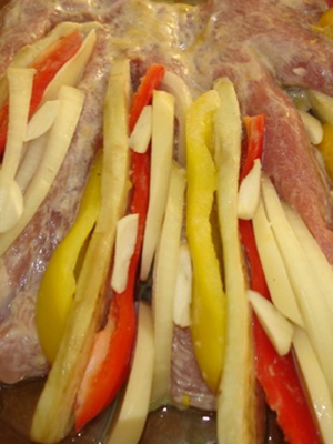 - “Viande à l'éventail” avec sauce, champignons, ail et tomates
