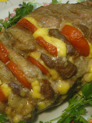 Faire des coupes dans le porc avant d'atteindre la fin avec un couteau. Ce devrait être un fan. Versez une partie de la sauce et mettez au four pendant une demi-heure à une température de 180 degrés. Ensuite, insérez les tomates dans les morceaux, versez le reste de la sauce et saupoudrez de fromage râpé. Le plat doit être laissé au four encore 20 minutes.Une fois la viande complètement cuite, vous pouvez la servir sur la table, coupée en portions de manière à ce que tout le monde ait un morceau de viande et des tomates.