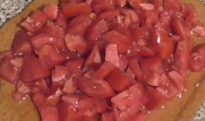Hacher finement les tomates, les mélanger avec les cuisses frites, l'ail et la mayonnaise.