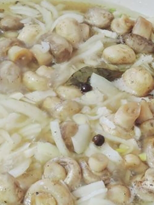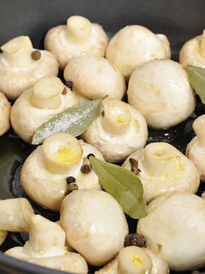 Mettez la casserole sur le feu, y mettez l'ail, l'huile, le vinaigre et les épices, versez 2 litres d'eau. Faites bouillir le contenu de la casserole et ajoutez les champignons. Cuire ensemble pendant 10-12 minutes à feu moyen sous un couvercle.