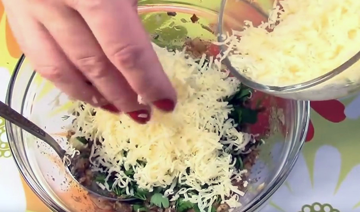 - Laisser refroidir la garniture, ajouter la crème sure, les légumes hachés, le sel au goût et la moitié des copeaux de fromage, mélanger.