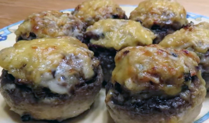 - Posez les chapeaux de champignons sur le dessus, saupoudrez de fromage et faites cuire à la cuisson pendant 20 minutes.