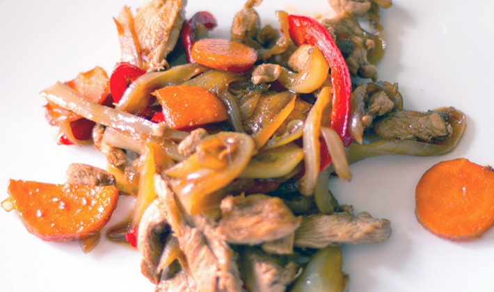 - Ajouter l'oignon et le poulet haché, en remuant constamment, faire frire 10 minutes.