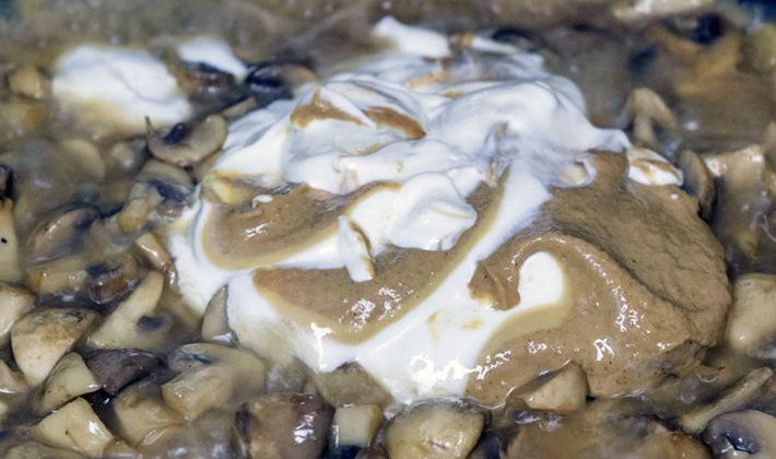 - Pendant ce temps, mélangez l'eau et la crème sure, versez dans une casserole et couvrez avec un couvercle.