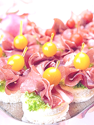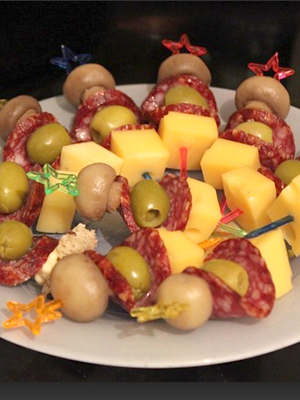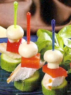 Canapés de dinde au jambon et aux champignons marinés en brochettes.