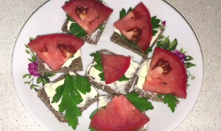 Mettez 1 tasse de tomate sur les tranches de pain, étalez dessus avec la masse cuite et saupoudrez de coriandre.
