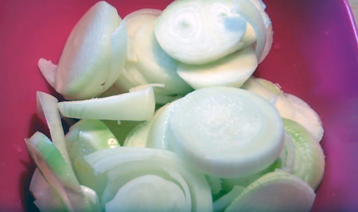 - Épluchez l'oignon, rincez à l'eau et coupez en quartiers minces.