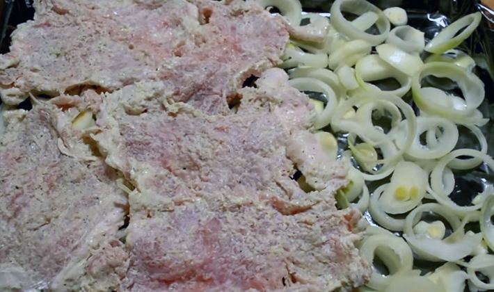- Graisser la viande avec de la sauce, mettre l'oignon coupé par dessus en fines rondelles ou quartiers.