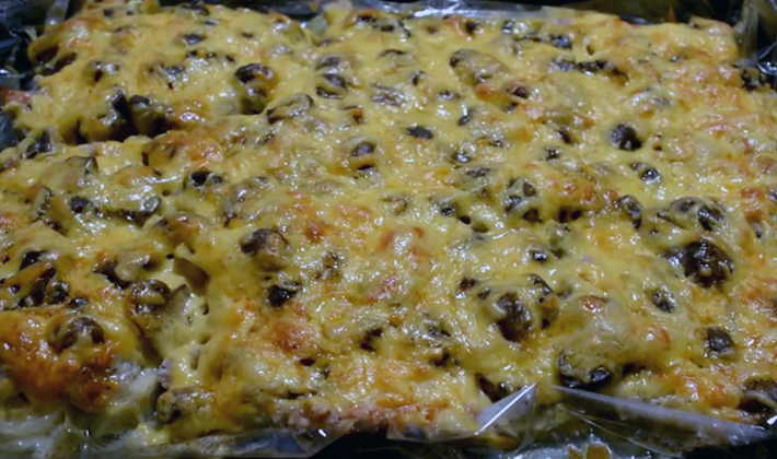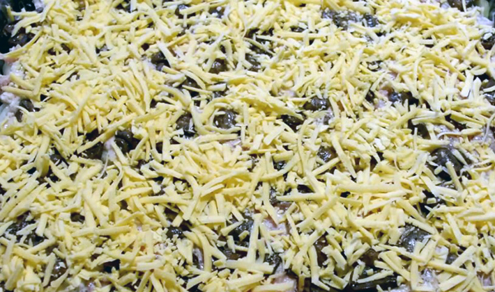 - La surface est enduite d'une couche de mayonnaise, saupoudrée d'une couche de fromage râpé.