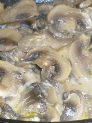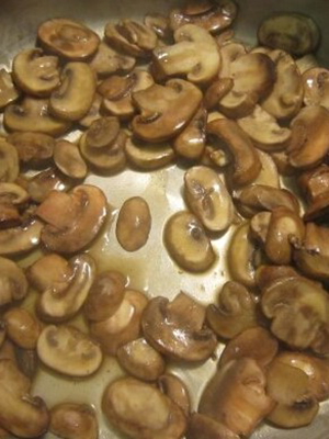 - Les champignons sont ajoutés et frits pendant 15 minutes, jusqu'à ce que tout le liquide libéré par les champignons s'évapore.