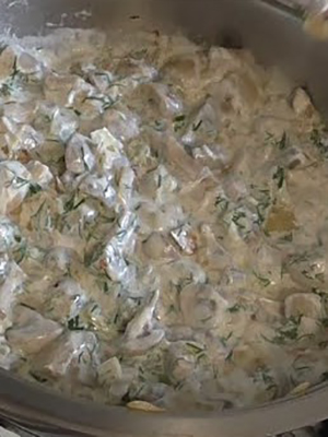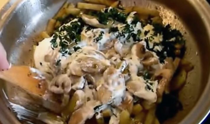 - Champignons à la crème et pommes de terre dans une casserole: recette avec photo