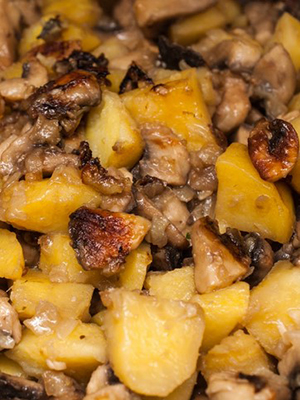 - Champignons dans une casserole avec du fromage et des pommes