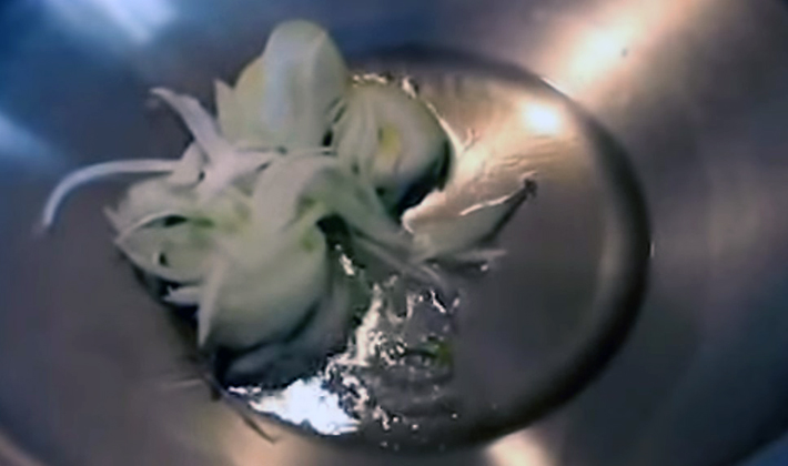 - Passer l'oignon demi-anneaux pendant quelques minutes jusqu'à coloration.