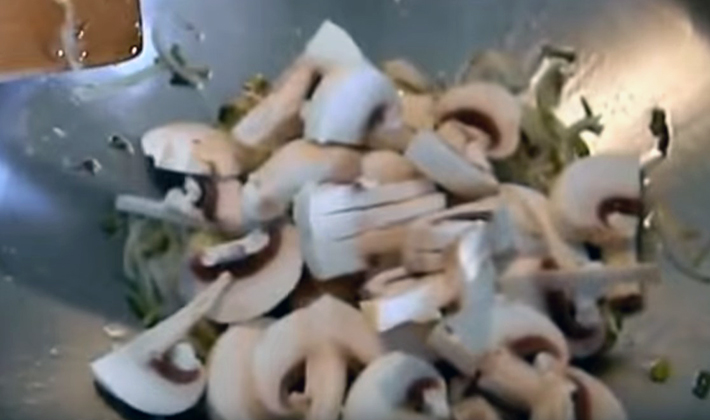 - Des plaques de champignons sont ajoutées, frites pendant 10 minutes, en remuant constamment.