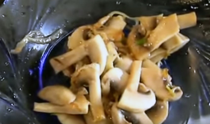 - Rincez rapidement les champignons à l'eau froide, mettez un torchon et après 10 minutes. coupé en plusieurs morceaux.