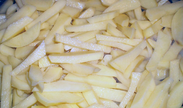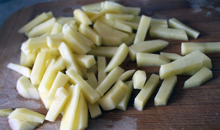 Épluchez les pommes de terre, coupez-les en lanières ou en rondelles, rincez-les abondamment à l'eau.