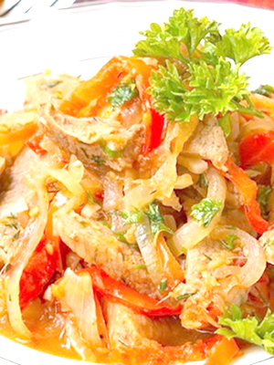 Boeuf aux champignons, poivrons et oignons au chaudron