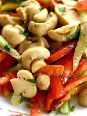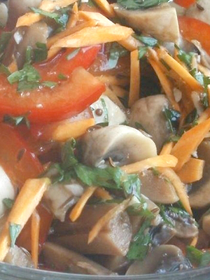 Garnir de champignons cuits avec des légumes, servir des pommes de terre fraîches bouillies, des carottes et du chou-fleur, ainsi qu’une salade verte de concombres et de radis frais.