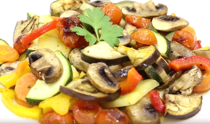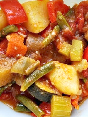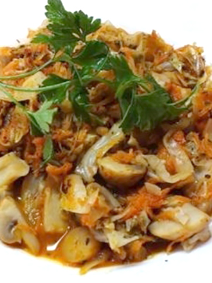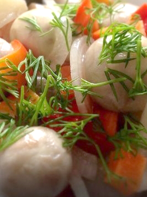 Les oignons pelés et lavés, le céleri, les carottes et les champignons sont hachés et compotés dans l'huile (dont un petit morceau est préalablement séparé) et une petite quantité d'eau est ajoutée. Faites cuire jusqu'à tendreté. Des tomates et des épices en dés sont ajoutés. Tout est transféré dans un plat résistant à la chaleur, versé avec de la farine diluée dans de l’eau froide, saupoudrée d’huile et du persil haché. Garnir de tranches de citron (sans peau ni pépins). Cuire au four pendant 30 minutes. Servir froid avec du pain sec ou des croûtons.