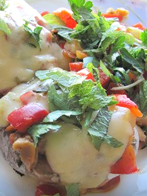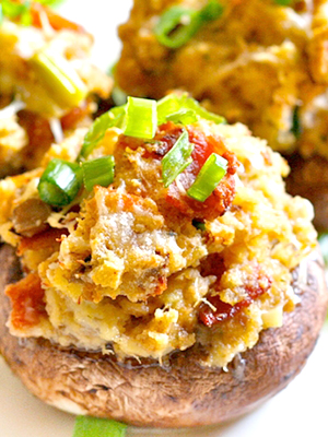 - Les champignons prêts à être farcis de légumes et cuits au four peuvent être décorés de tranches de poivrons colorés et de brins d'herbes.