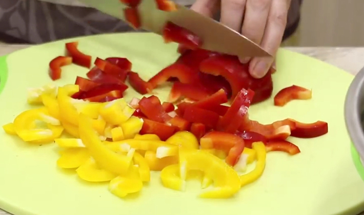 Rincer le poivron, peler les graines, les couper en fines lanières. Rincer les courgettes, enlever les extrémités, hacher. Épluchez et hachez l'oignon.