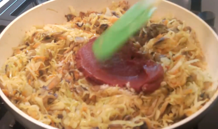 Chou blanc mettre sur une casserole préchauffée avec de l'huile végétale, ajouter 4 c. à soupe d'eau, laisser mijoter jusqu'à tendreté. Cuire séparément les légumes: carottes, oignons et persil. Râpez les carottes, hachez l'oignon en cubes, hachez le persil. Spassez tous ces composants dans de l'huile végétale, en ajoutant de la farine et de la pâte de tomates à ce mélange.
