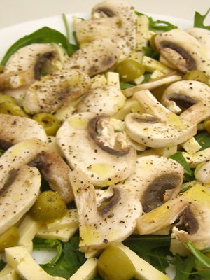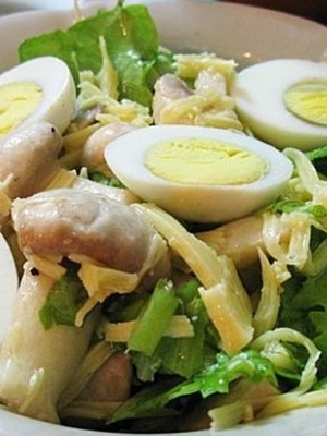- Salade au poulet, champignons marinés, fromage, ail et oeuf