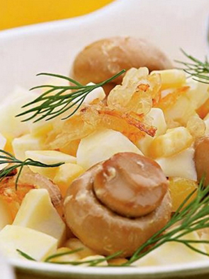 - Salade à l'œuf, champignons sautés, oignons et fromage