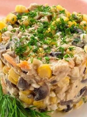 Vous devez noter que les carottes peuvent être remplacées par un autre ingrédient: vous obtiendrez alors une salade très savoureuse avec des champignons marinés, un œuf à la coque et du maïs (pas plus de 100 g). Au fait, les connaisseurs de mets exquis décorent cette œuvre d’art avec un brin de persil.