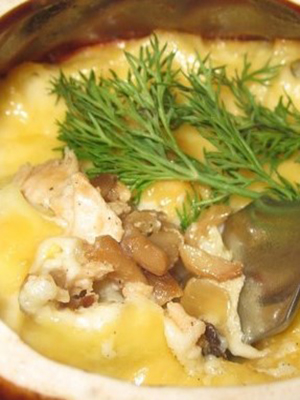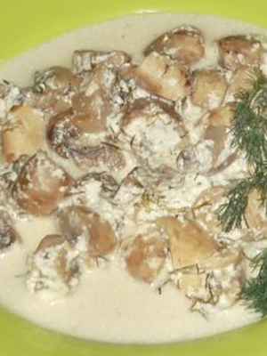 Champignons frais, préparés et transformés, faire frire dans une casserole avec l'ajout d'œufs finement hachés, verser la crème sure et cuire au four saupoudrés de fromage râpé.