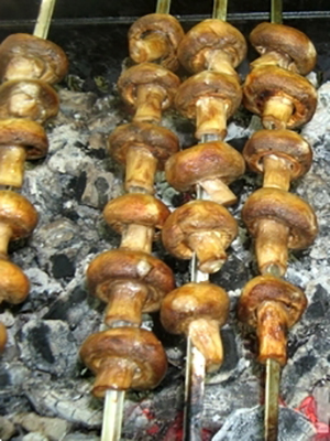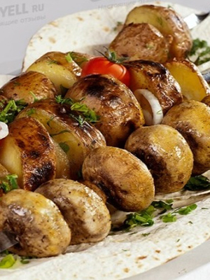 Laisser au froid pour laisser mariner une heure. Après cela, placez les brochettes sur le charbon pas trop chaud ou faites-les griller avec les brochettes aux champignons.