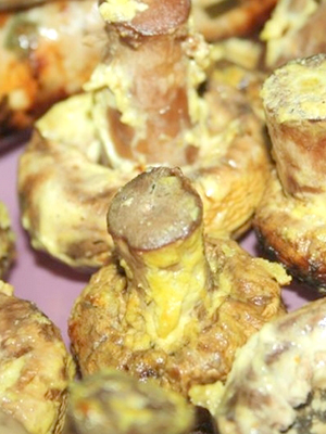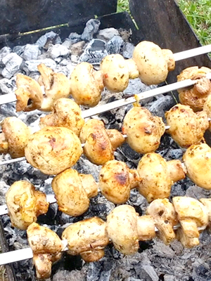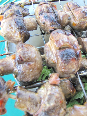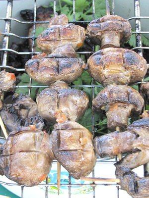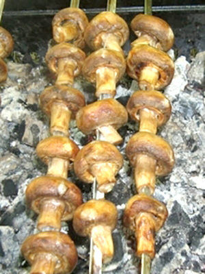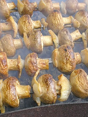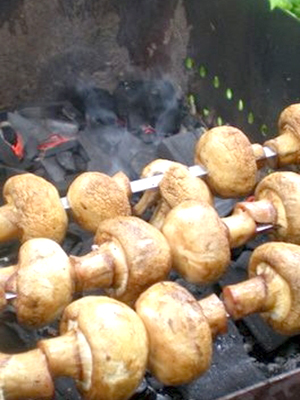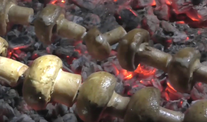 Disposer les champignons marinés sur une grille, les déposer sur du charbon bien chauffé et les faire frire pendant 20 minutes.