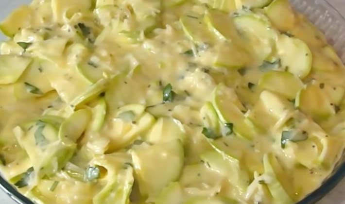 - Verser les courgettes aux champignons dans le mélange préparé et saupoudrer de fromage râpé.