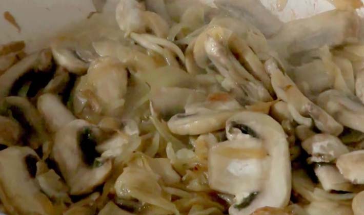 - Hacher finement les champignons et les oignons. Faire frire l'oignon d'abord pendant 2 minutes, puis ajouter les champignons et laisser mijoter jusqu'à cuisson complète. Sel, poivre