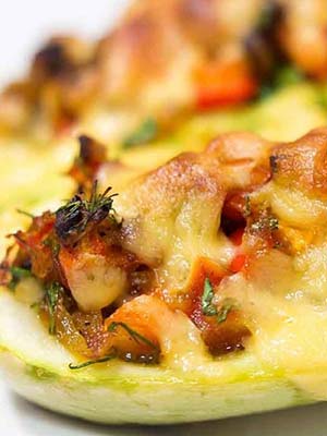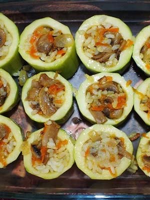 - Jeunes courgettes, sans les peler, coupées en deux. Retirez la moitié de la pulpe de chaque moitié. Remplissez les vides formés avec de la viande hachée refroidie.