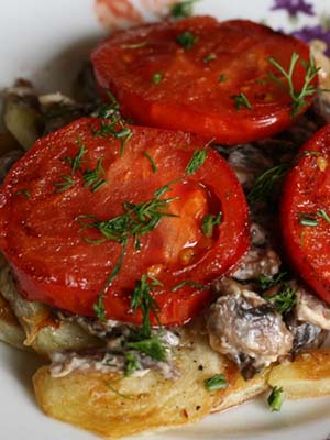 Pour cuisiner des courgettes avec des champignons et des tomates conformément à cette recette, vous devez faire frire des oignons et des champignons finement hachés, et les mettre dans une casserole. Séparément, faites cuire les courgettes coupées en cubes, mettez-les dans une casserole avec les champignons, salez, versez un peu d'eau et laissez mijoter pendant 10 minutes. Ajouter les tomates hachées, la crème sure et laisser mijoter jusqu'à cuisson complète. Servir les courgettes cuites avec des champignons et parsemer d'herbes finement hachées.